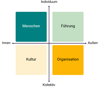 Die Räume Lebendiger Arbeit sind angelehnt an das 4-Quadranten-Modell von Ken Wilber und machen zentrale Perspektiven in Organisationen sichtbar. Sie unterscheiden wird zwischen Innenwelt und Außenwelt, sowie Individuum und Kollektiv. Daraus ergeben sich die vier Räume: